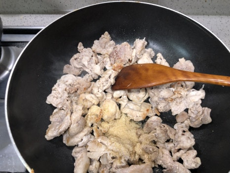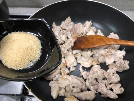 고기가 적당히 익었으면 설탕을 넣고 설탕이 놓을때까지 볶아줍니다.