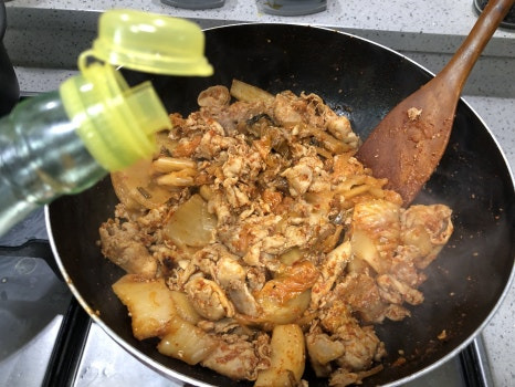고추가루▶다진마늘▶간장▶김치 를 넣고 수분이 날라갈때까지 볶아줍니다.