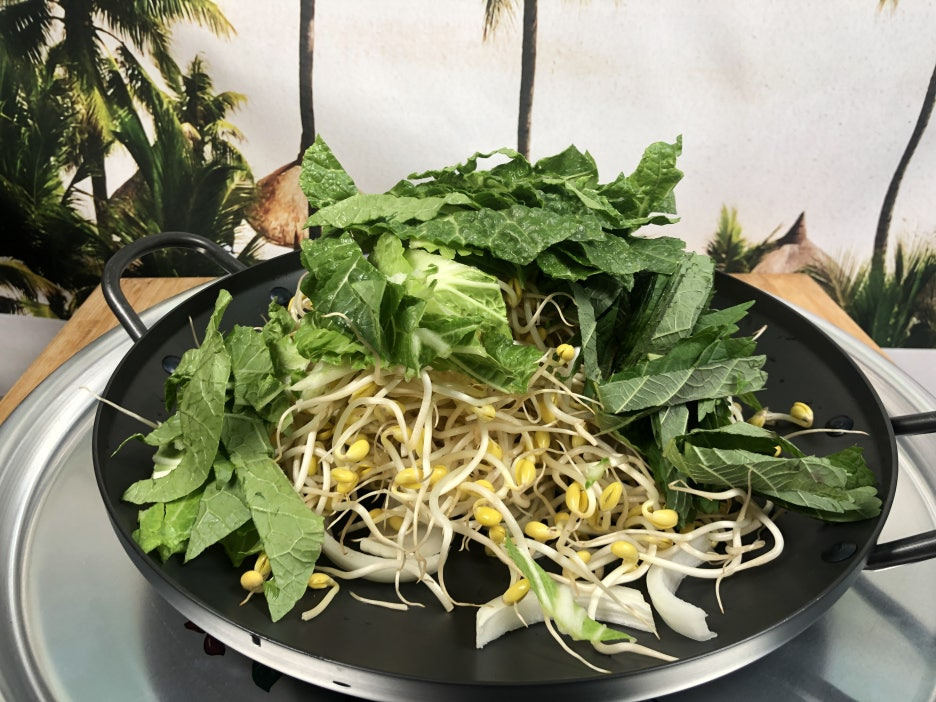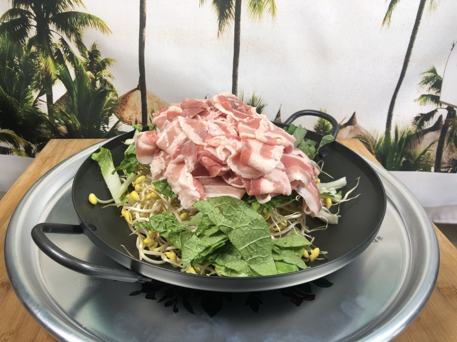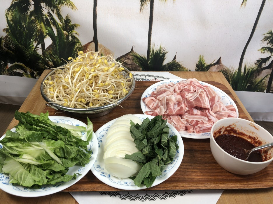 바닥에 양파▷콩나물▷ 봄동▷ 깻잎▷대파▷ 대패삼겹살▷ 양념장 순으로 준비해 줍니다.