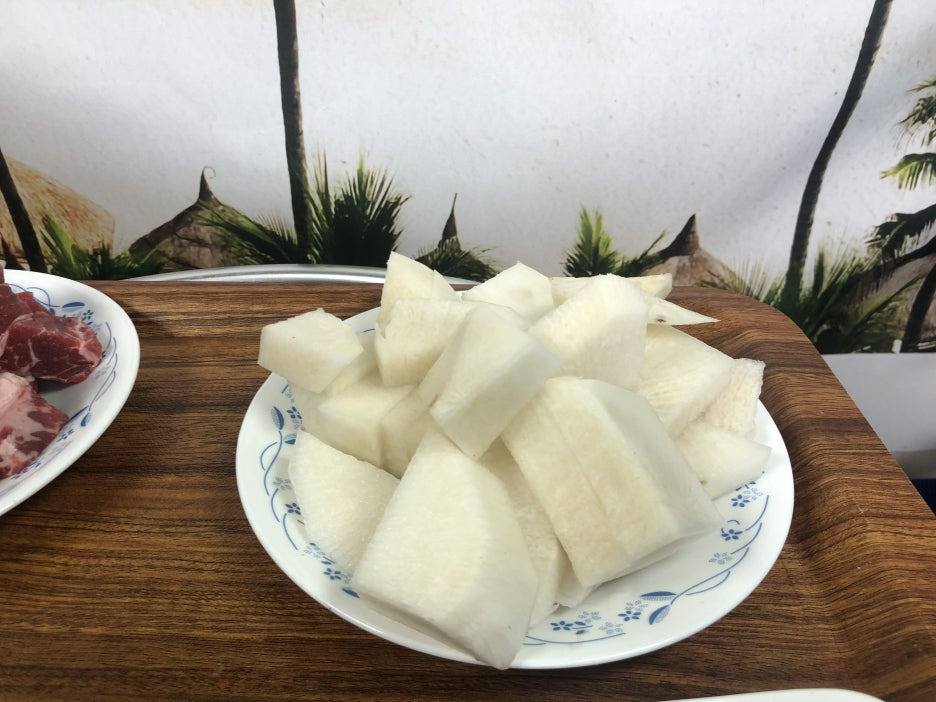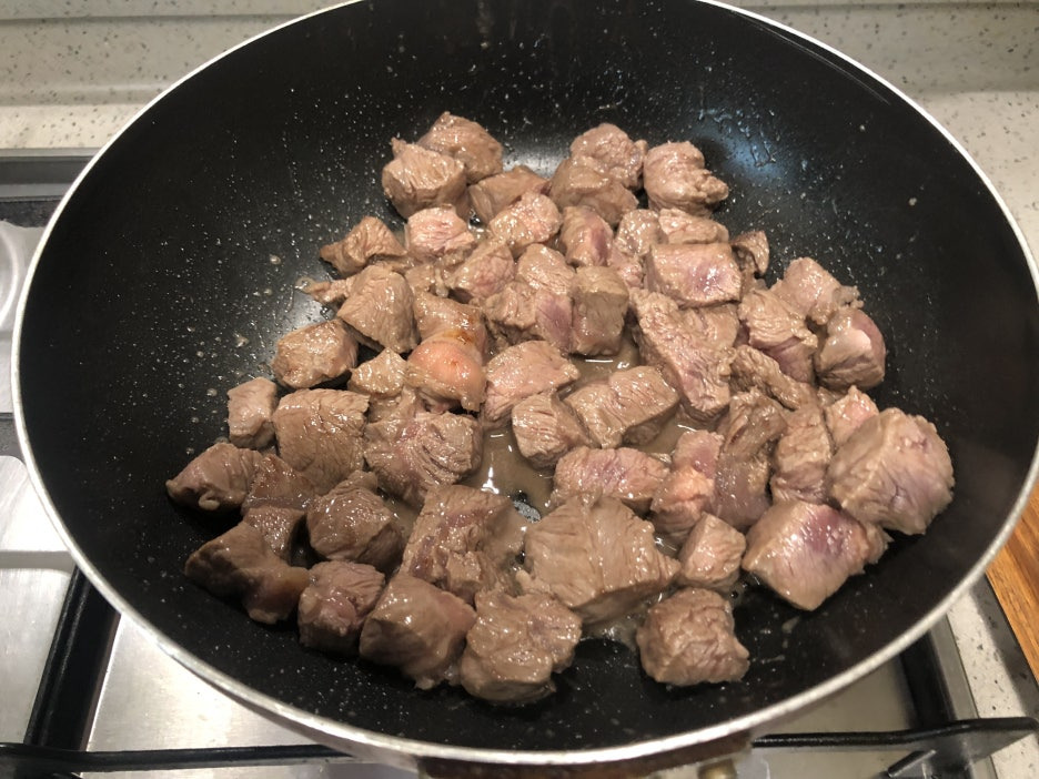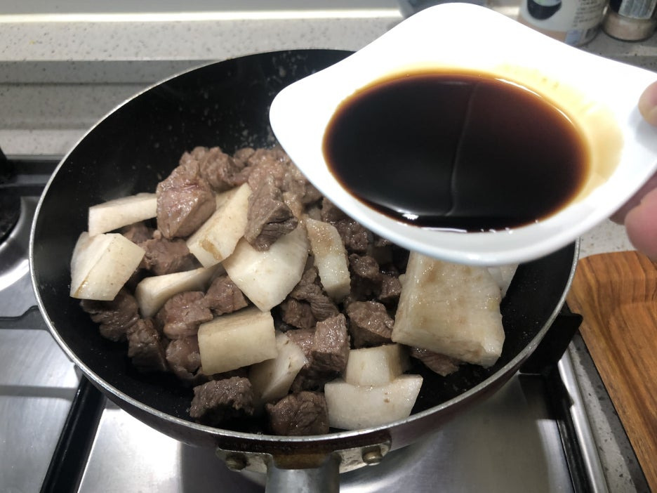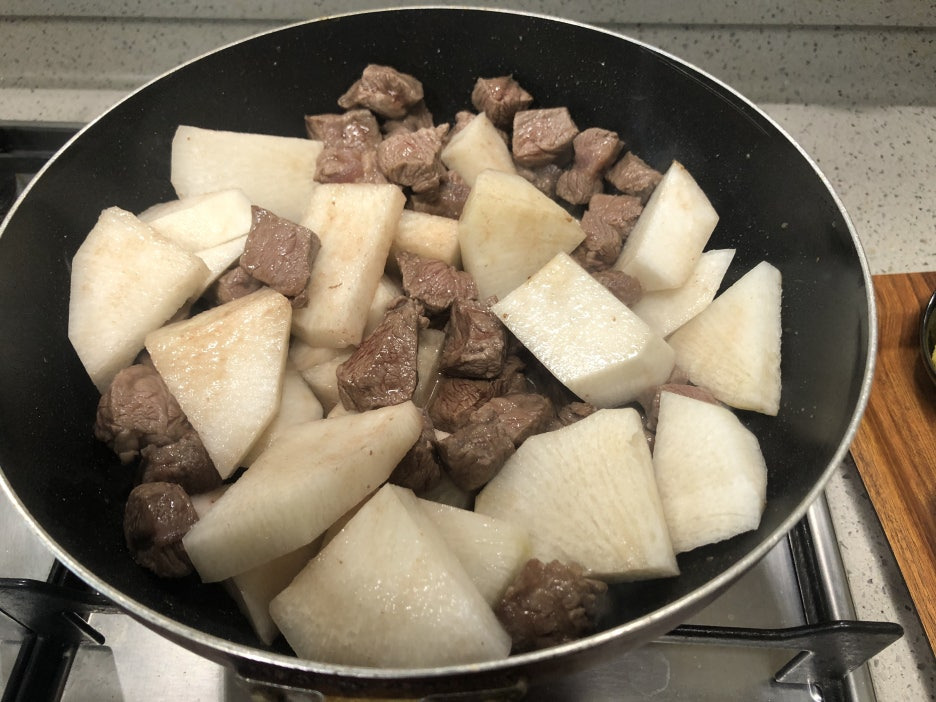 소고기가 노릇노릇 익으면 무를 넣어줍니다.