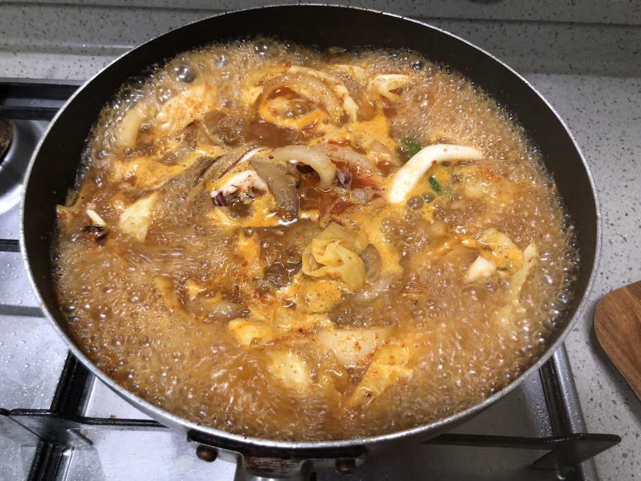 오징어, 청양고추,치킨파우더,굴소스를 넣고 팔팔 끓여줍니다.