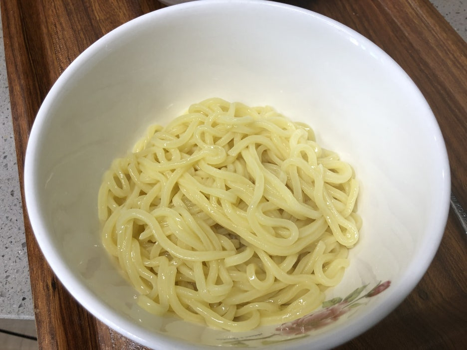 냉동 중화면을 팔팔 끓는 물에 2~3분간 끓여준후 찬물로 행궈 그릇에 담아 준비합니다.