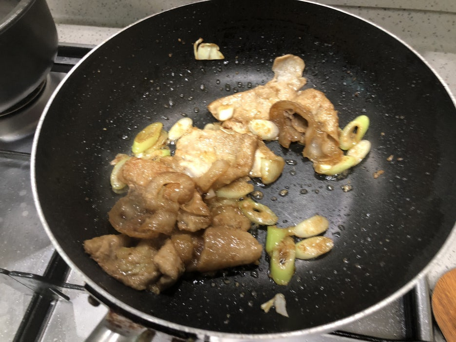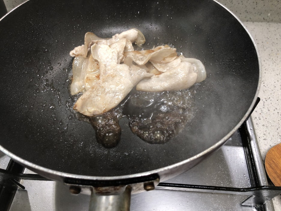 팬에 기름을 2스프푼 두르고 돼지고기를 넣고 충분히 익혀줍니다.